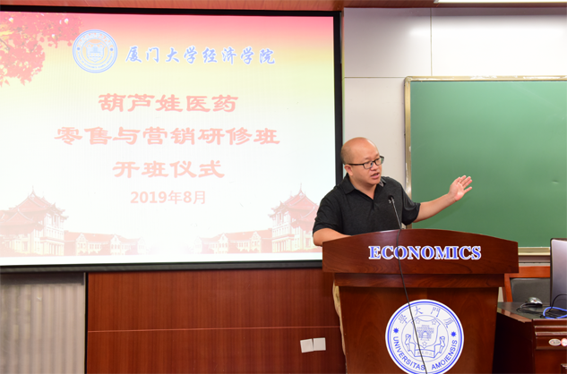 在开班仪式上,廖景峰主任首先代表厦门大学经济学院热烈欢迎贝斯特医药零售与营销研修班的学员到厦大学习,并就厦门大学及经济学院的相关情况进行了介绍。他说,贝斯特学员走进厦大就是厦大的校友,希望未来的日子能够关心、支持母校的发展,多提宝贵意见,同时他也祝大家在厦大学习期间学有所成、学有所获。