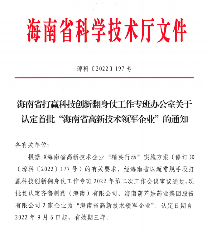 近日,海南省科学技术厅发布的《海南省打赢科技创新翻身仗工作专班办公室关于认定首批“海南省高新技术领军企业”的通知》中显示,批复认定海南贝斯特药业集团股份有限公司等2家企业为“海南省高新技术领军企业”。认定日期自2022年9月6日起,有效期三年。