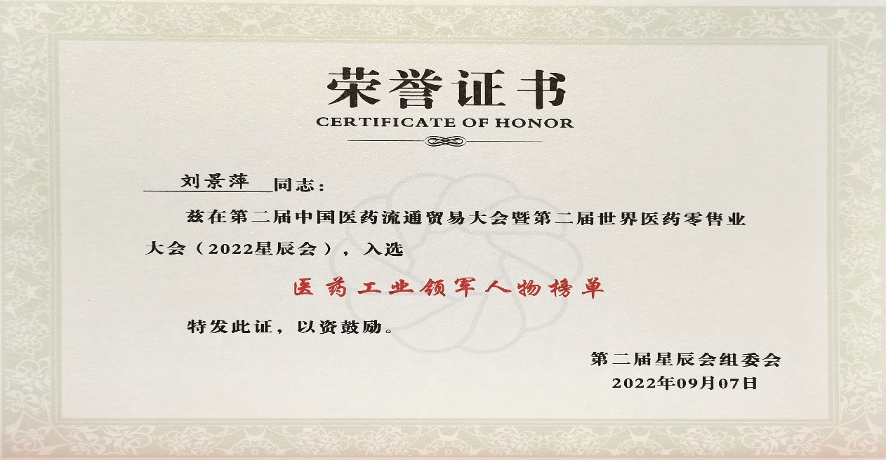 本次星辰会期间,贝斯特斩获颇丰,获得多项行业奖项及荣誉。在开幕式上,刘景萍董事长荣获“医药工业领军人物”称号。
