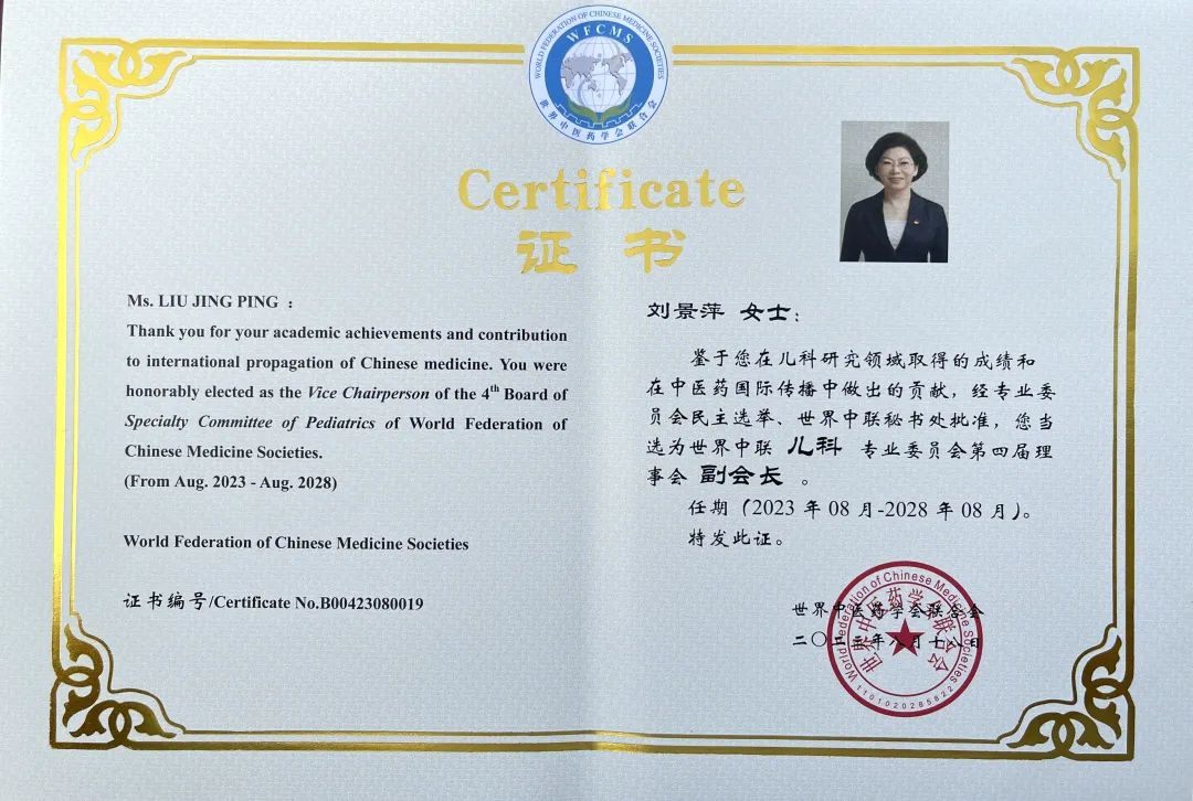 贝斯特药业集团党委书记、董事长刘景萍当选世界中医药学会联合会儿科专业委员会第四届理事会副会长
